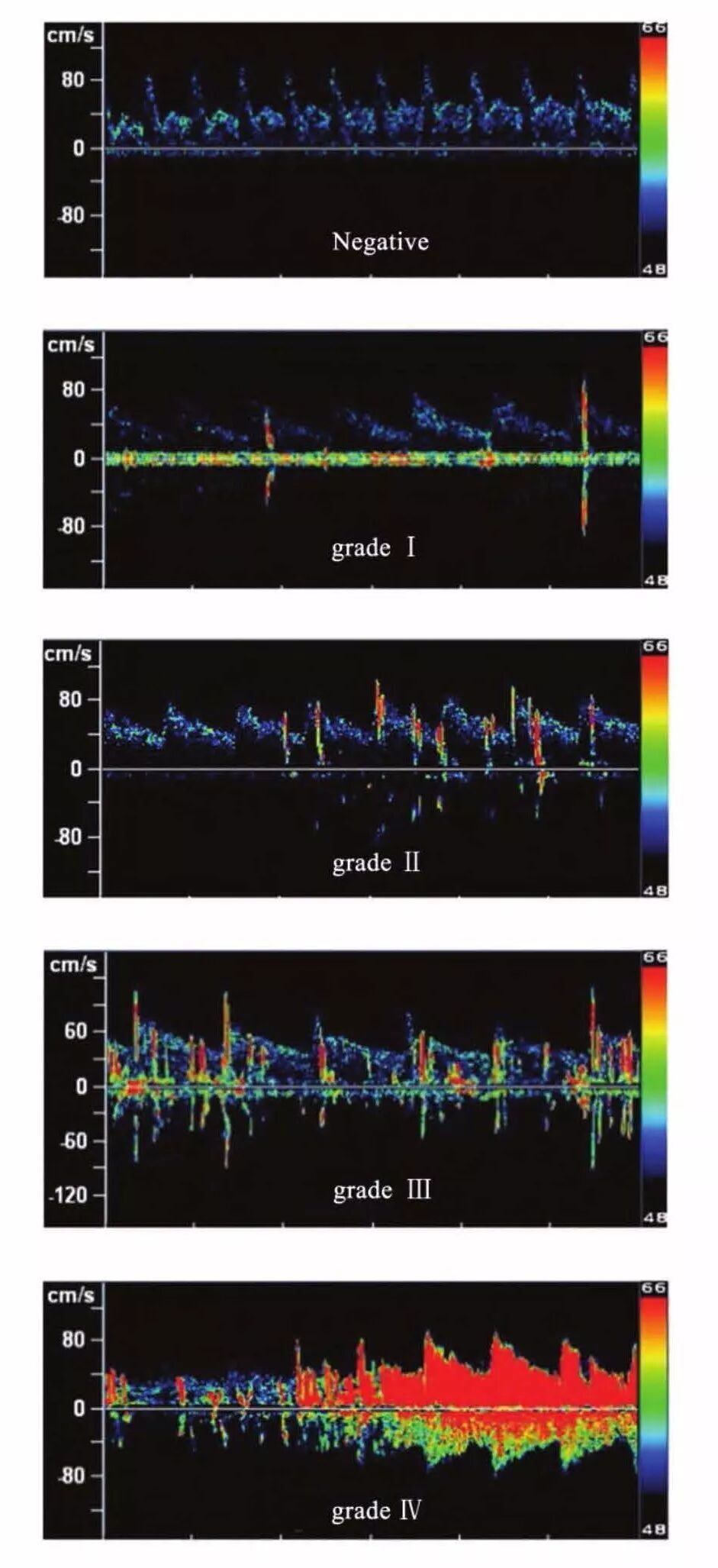 所有研究對象的RLS的診斷及分流量由1名神經(jīng)內(nèi)科醫(yī)師和1名TCD技術員共同判斷,且他們對研究對象的診斷分組不知情。RLS分流量的分級辦法是根據(jù)吉林大學第一醫(yī)院邢英琦等提出的5級分級法[4]:①無分流:0個微泡信號;②Ⅰ級分流:1~10個微泡信號,即小量分流;③Ⅱ級分流:11~25個微泡信號,即中量分流;④Ⅲ級分流:大量分流,>25個微泡信號但未形成雨簾狀;⑤Ⅳ級分流:雨簾狀大量分流,無法精確計算的大量微泡信號(見圖2)。RLS的分型:①固有型:靜息狀態(tài)下就能檢測到微泡信號;②潛在型:靜息狀態(tài)下無微泡信號,Valsalva動作后才能檢測到微泡信號。