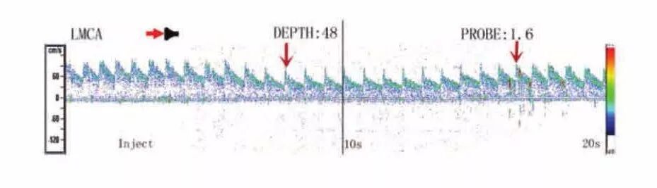 培訓并熟練操作的護士組成。操作流程:①監(jiān)測左側(cè)大腦中動脈(LMCA),設置為雙深度模式(取樣容積10,深度差12),選取深度在48~52/60~64mm;②顯示血流監(jiān)護曲線,幫助判斷Valsalva動作的完成效力,有效的Valsalva動作的血流曲線表現(xiàn)為先下降再升高(見圖1);③患者取仰臥位,肘靜脈留置通路,接三通開關,三通開關分別接兩支10ml注射器,其中一支裝有9ml生理鹽水+1ml清潔空氣并回抽一滴患者的血液[3],然后兩個注射器來回推注20次,制作成混血激活生理鹽水;④單通道監(jiān)測模式進行記錄,按下秒表,將混血激活生理鹽水“彈丸”式全部注射,記錄推注后20s內(nèi)的血流及栓子信號情況;⑤間隔2分鐘;⑥再次進入監(jiān)測記錄模式,再次推注混血激活鹽水,囑患者在推注后5秒做Valsalva動作,即深吸氣后屏氣10s,再呼氣,觀察TCD屏幕20s內(nèi)的血流及栓子信號情況;⑦間隔2分鐘,重復步驟⑥一次。