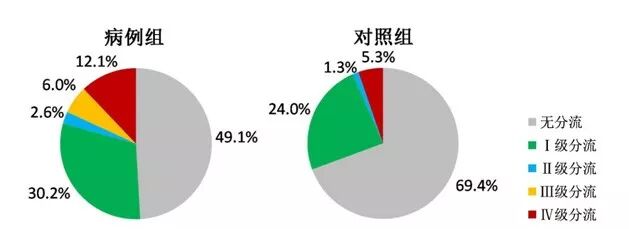 2.1 病例組和對照組的RLS陽性率及分流量如下。在病例組中,RLS的陽性率為50.9%(59/116),其中,Ⅰ級分流35例(30.2%),Ⅱ級分流3例(2.6%),Ⅲ級分流7例(6.0%),Ⅳ級分流14例(12.1%)。對照組中,RLS的陽性率為30.6%(23/75),其中,Ⅰ級分流18例(24.0%),Ⅱ級分流1例(1.3%),Ⅲ級分流0例(0%),Ⅳ級分流4例(5.3%)。以上率的分布見圖3。