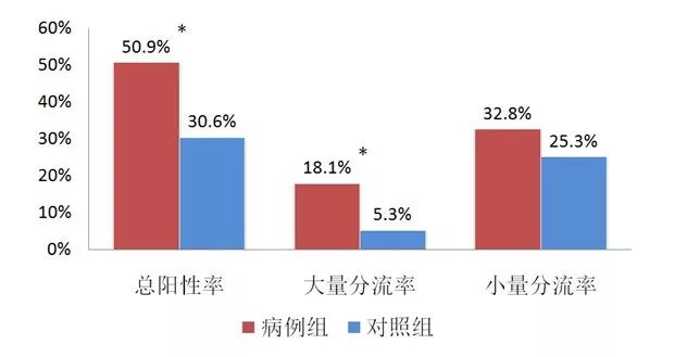 圖4 兩組RLS總陽性率、大量分流率、小量分流率的比較(*代表有顯著差異)